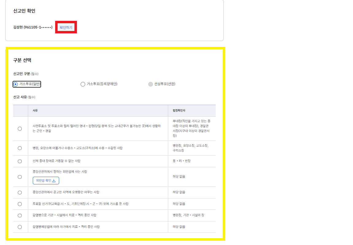 스크롤을 아래로 내리면 본인 이름 옆에 '확인하기'라는 위 사진에서 빨간색으로 표시된 버튼이 있습니다. 그걸 클릭해 주시면 노란색 박스로 표시된 항목들이 나옵니다. 본인이 어떤 유형(거소투표 일반, 거소투표 등록장애인, 선상투표)에 해당되는지 정해주시고 아래 나오는 신고사유 항목들을 보고 본인이 해당하는 곳에 체크해 주시면 됩니다.