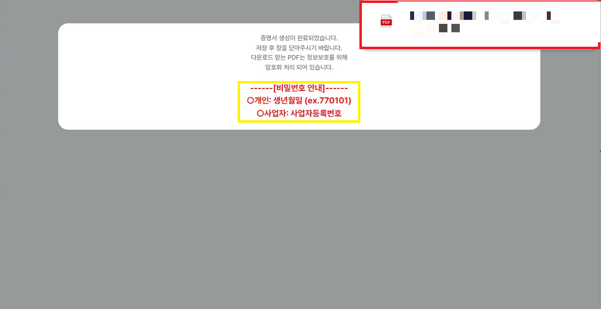 저의 경우엔 '프린트 출력'을 선택하였기에 위의 사진처럼 나왔습니다. 바로 파일이 하나 다운로드되고 아래에는 자동으로 잠겨있는 파일의 비밀번호 안내가 나옵니다. 개인의 경우 생년월일, 사업자의 경우 사업자등록번호입니다.
