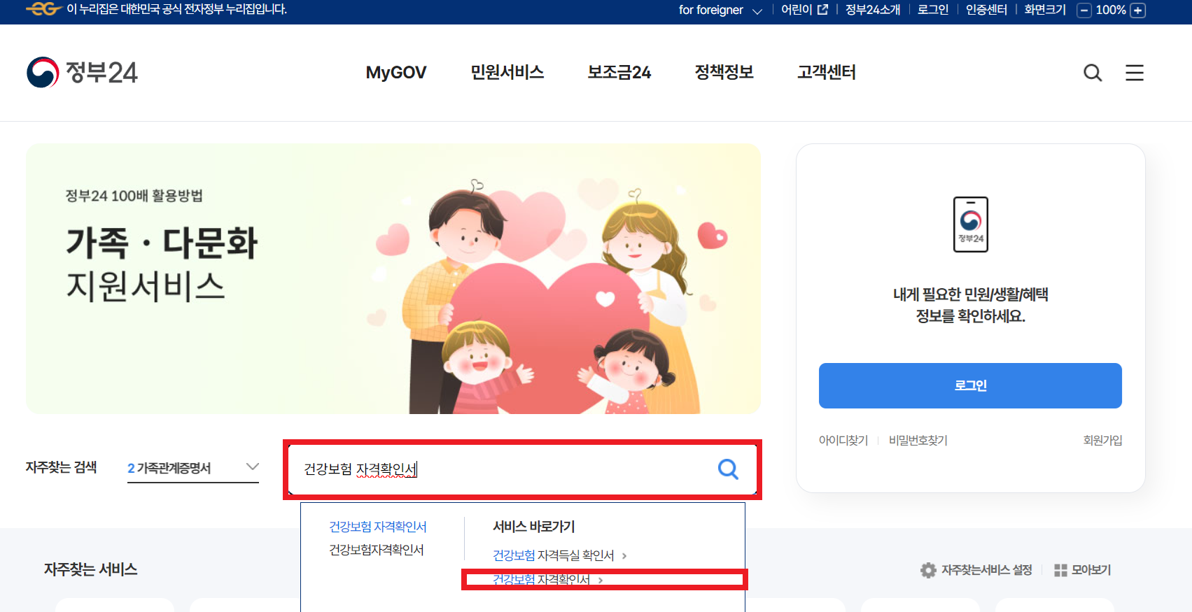 정부24에 접속하여 가운데 검색창에 '건강보험 자격확인서'를 검색한 뒤 첫 번째 자격득실확인서가 아닌, 두 번째 자격확인서를 클릭해 줍니다.