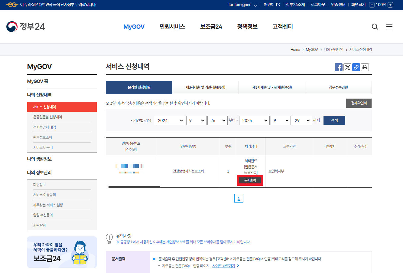 민원신청하기를 누르면 위와 같이 서비스 신청내역이 나옵니다. 여기서 본인의 민원 신청내역을 확인하시고, 빨간색으로 표시된 '문서출력' 버튼을 눌러주시면 됩니다.