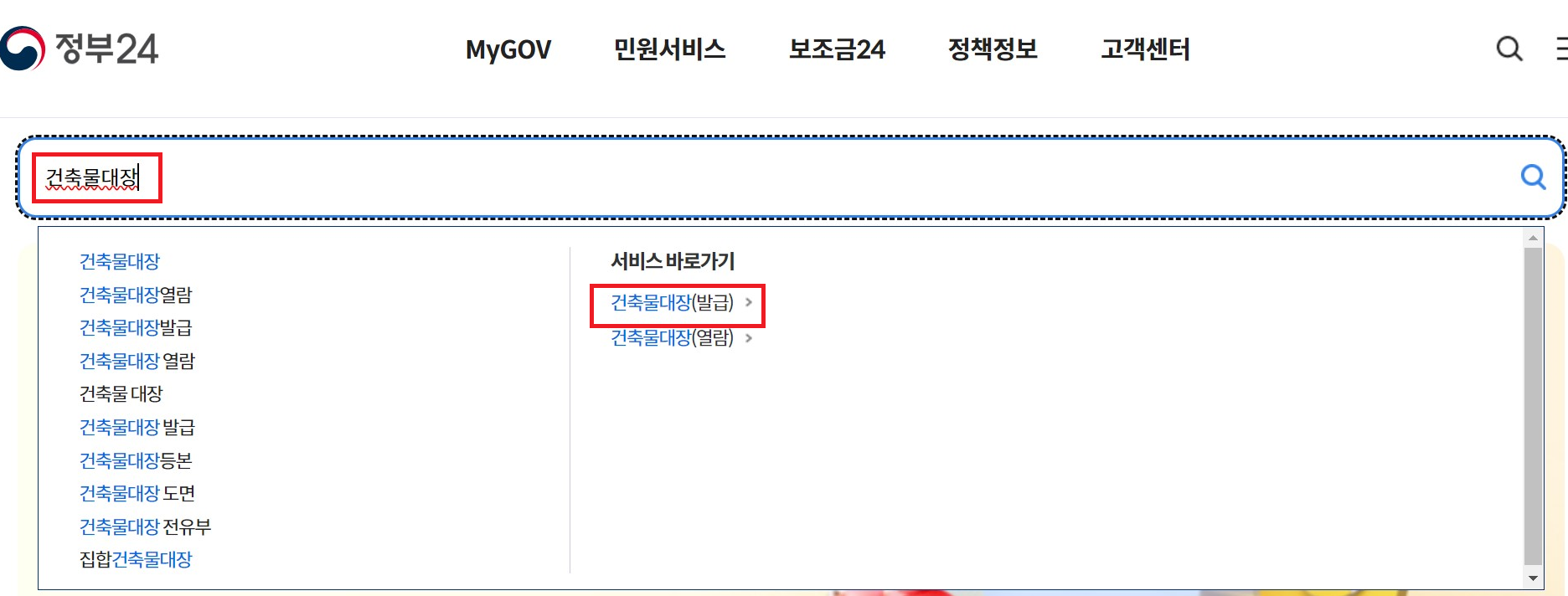 정부 24에 들어가 검색창에 건축물대장을 검색하신 뒤, 아래 빨간색으로 표시된 '건축물대장'을 클릭해 줍니다.