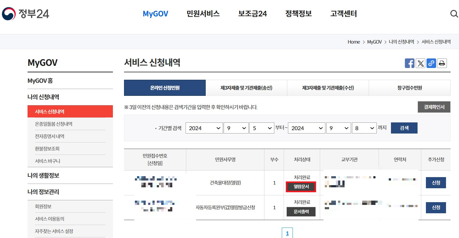 4) 민원신청내역 확인 및 열람문서 클릭