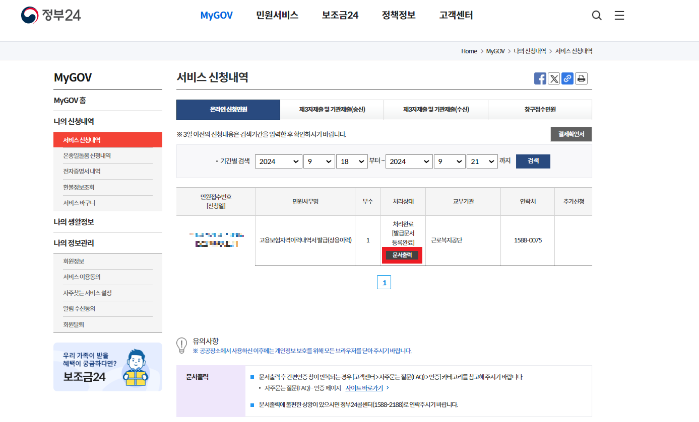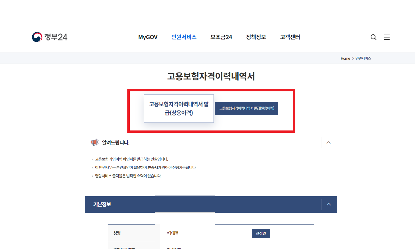 정부 24에 들어가 위 사진처럼 검색창에 고용보험자격이력내역서를 검색해 줍니다. 그리고 아래 빨간색으로 표시된 부분을 클릭해 줍니다.