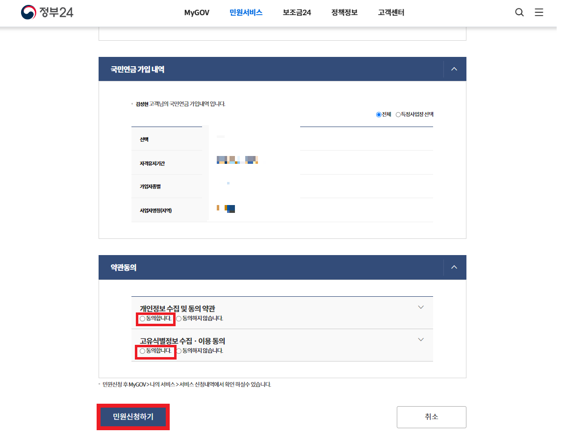 5) 가입내역 확인, 약관 동의 후 '민원신청하기' 클릭