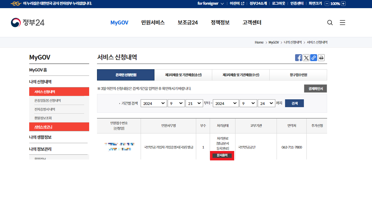 서비스 신청내역에서 신청한 민원을 확인 후, 문서출력버튼을 눌러줍니다.