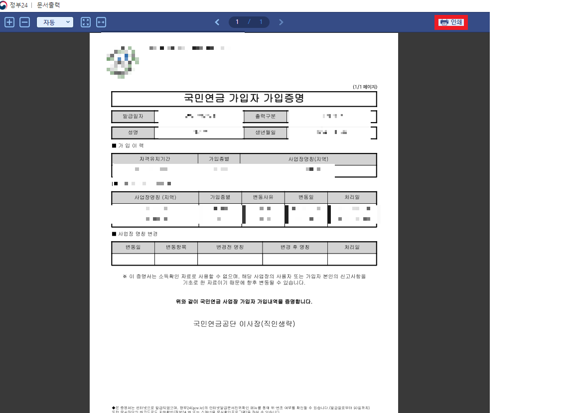 '문서출력'을 클릭하시면 위와 같이 국민연금 가입자 가입증명서가 뜹니다. 이때 본인의 사항을 확인하신 후, 오른쪽 상단에 있는 '인쇄' 버튼을 눌러주시면 끝입니다.