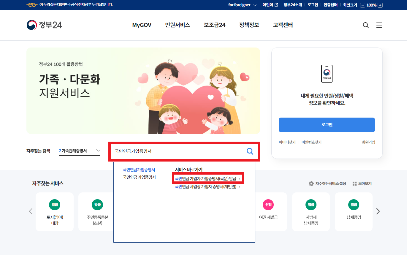 정부 24에 접속하셔서 가운데 검색창에 '국민연금가입증명서'를 검색해 주시면 자동으로 아래 빨간색으로 표시된 '국민연금 가입자 가입증명서(국문) 발급'이 나옵니다. 여기를 클릭해 줍니다.