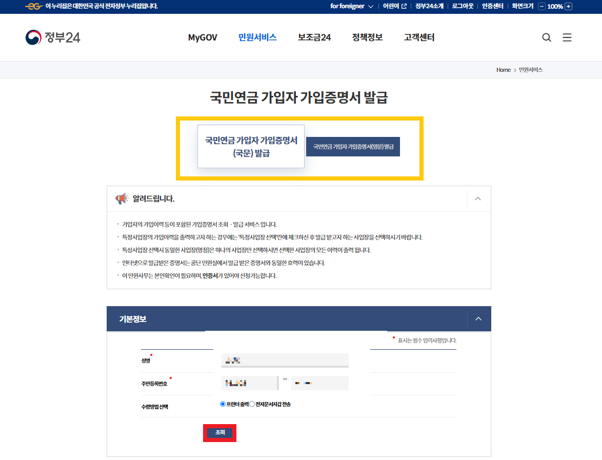 국민연금 가입자 가입증명서는 국문과 영문 모두 발급이 가능합니다. 따라서 본인에게 상단 노란색으로 표시된 옵션 두 개 중 본인에게 필요하신 언어로 발급해 주시면 됩니다. 이후 기본정보 칸에 자신의 인적사항이 나오고, 이를 확인하셨으면 아래 '조회' 버튼을 클릭해 주시면 됩니다.