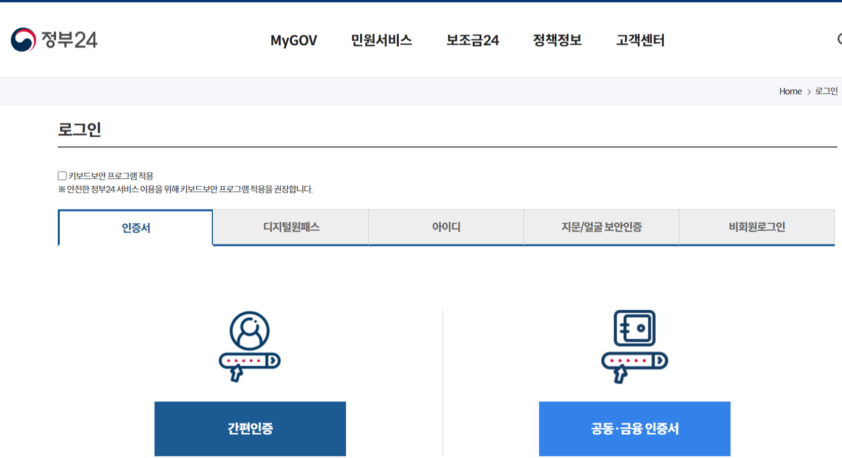 신청하기 버튼을 클릭했을 때 로그인을 하지 않은 상태라면 아래와 같이 로그인화면이 뜰 겁니다. 로그인을 할 수 있는 방법은 여러 가지가 있습니다. 요즘은 꼭 공인인증서가 아니어도 민간인증서(네이버 등)로 로그인하실 수 있기 때문에 본인에게 가장 편한 방법으로 로그인하시면 되겠습니다.