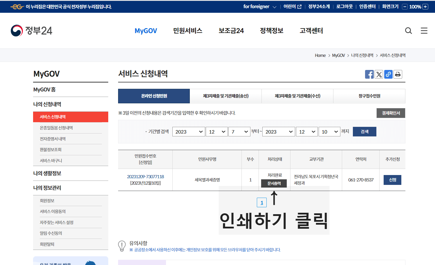 8) 서비스 신청내역 확인 및 인쇄하기
