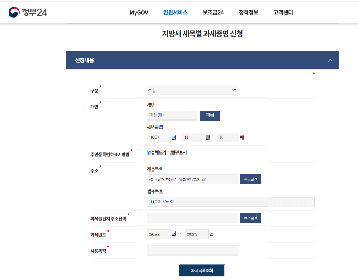 추가로 적으실 건, '과세물건지'와 '사용목적'입니다. 과세 연도의 경우엔 본인이 수정하고 싶으시다면 수정하실 수 있습니다. 과세물건지엔 본인에게 과세되는 소득의 원천을 적어주시면 됩니다. 그 후 '과세목록조회'라는 버튼을 클릭해 줍니다. 참고로 주소마다 별개로 신청해주셔야 하므로 이점 유의해주세요!