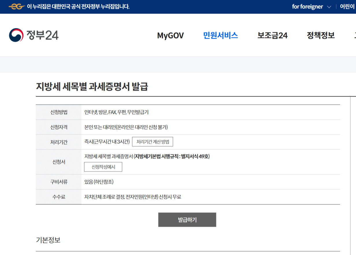 클릭해서 들어가면 신청방법부터 신청자격 그리고 처리기간과 신청서 등이 안내되어 있는 페이지가 나옵니다. 아래 발급하기 버튼을 클릭해 줍니다. 참고로 인터넷으로 세목별 과세증명서를 신청할 시 수수료는 무료입니다.