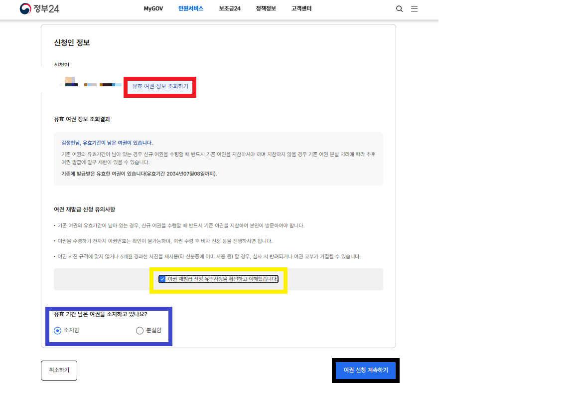 그렇게 되면 아래 파란 박스가 생기고 본인이 유효 기간 남은 여권을 소지하고 있는지 체크해 주신 다음에 오른쪽 하단 파란색으로 표시된 '여권 신청 계속하기'를 눌러줍니다.