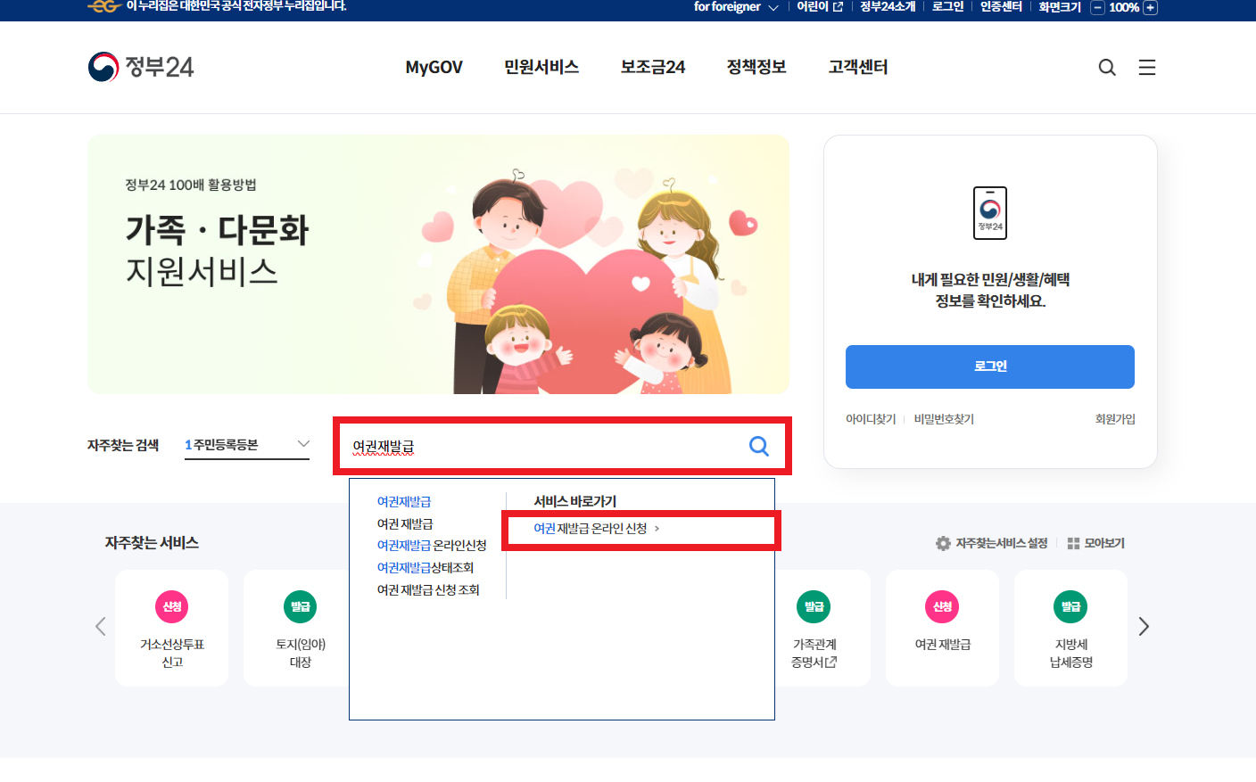 정부 24에 들어가 가운데 검색창에 '여권 재발급'이라 치시면 아래 빨간색으로 표시된 것처럼 '여권 재발급 온라인 신청'이 있습니다. 그걸 클릭해 주시면 됩니다.