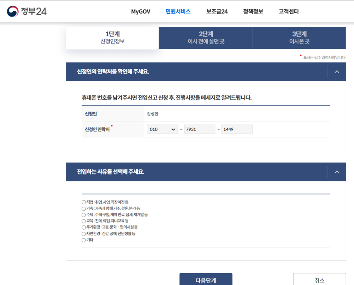 안내된 전입신고 유의사항을 다 읽으시고 맨 아래 확인했냐는 질문란에 '예'라는 체크를 해주신 후 다음 화면으로 넘어가면 이름과 연락처 그리고 전입사유를 적는 란이 있습니다. 확인하고 해당하는 사항에 체크하고 다음으로 넘어갑니다.
