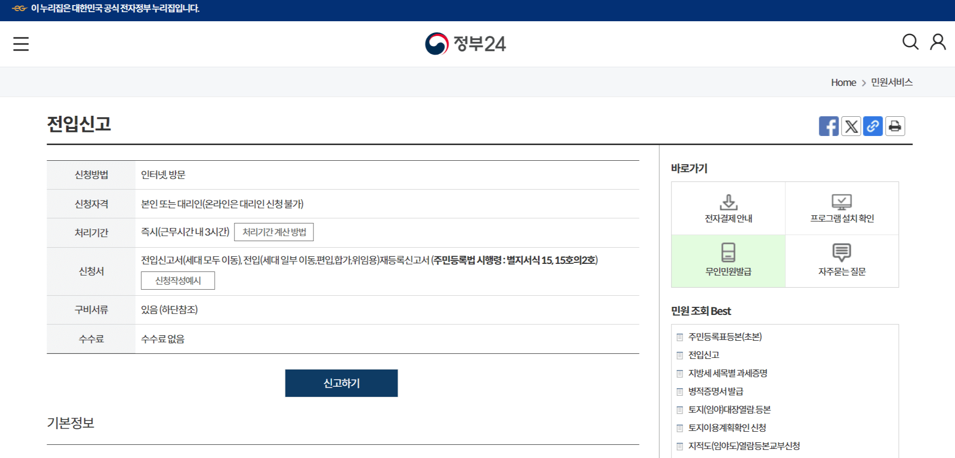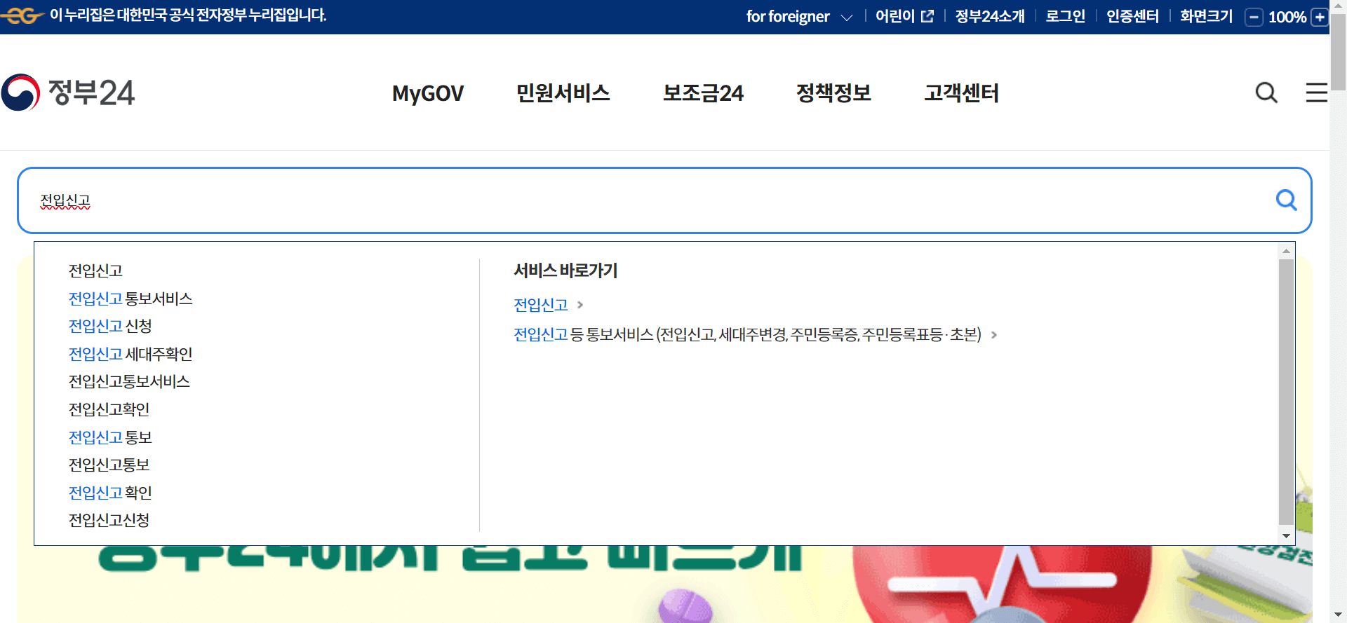 접속하면 아래의 사진처럼 검색창에 '전입신고'를 검색해서 들어가 줍니다.