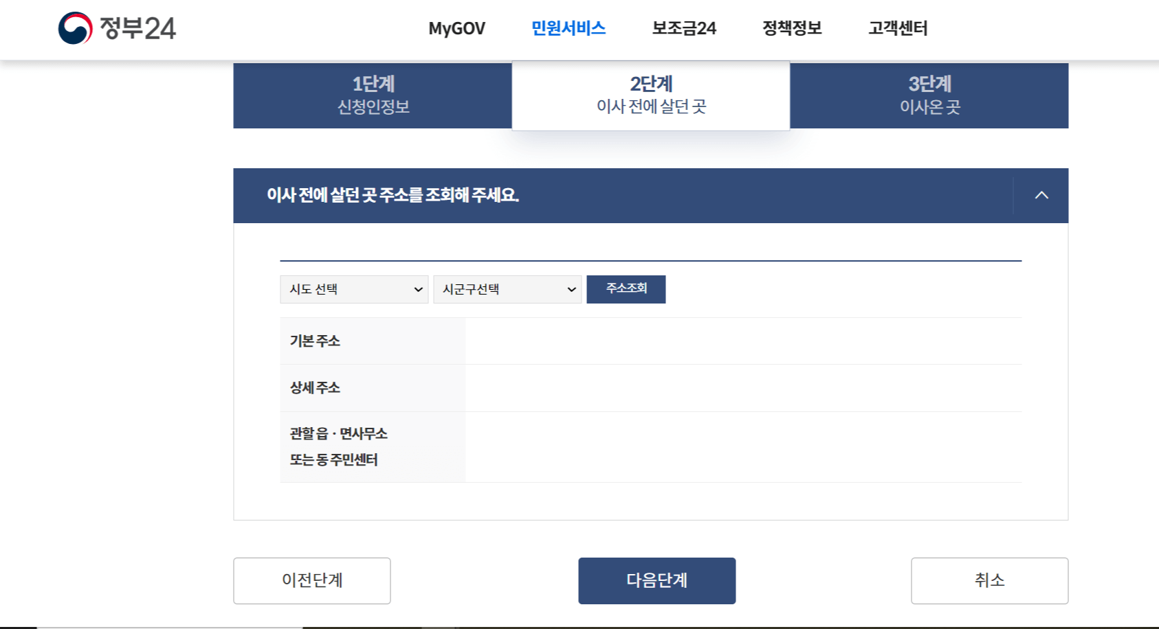 넘어가면 아래와 같은 화면이 뜨는데요, 우선 이사 온 곳의 주소를 입력해 줍니다.