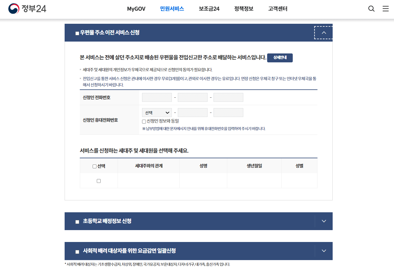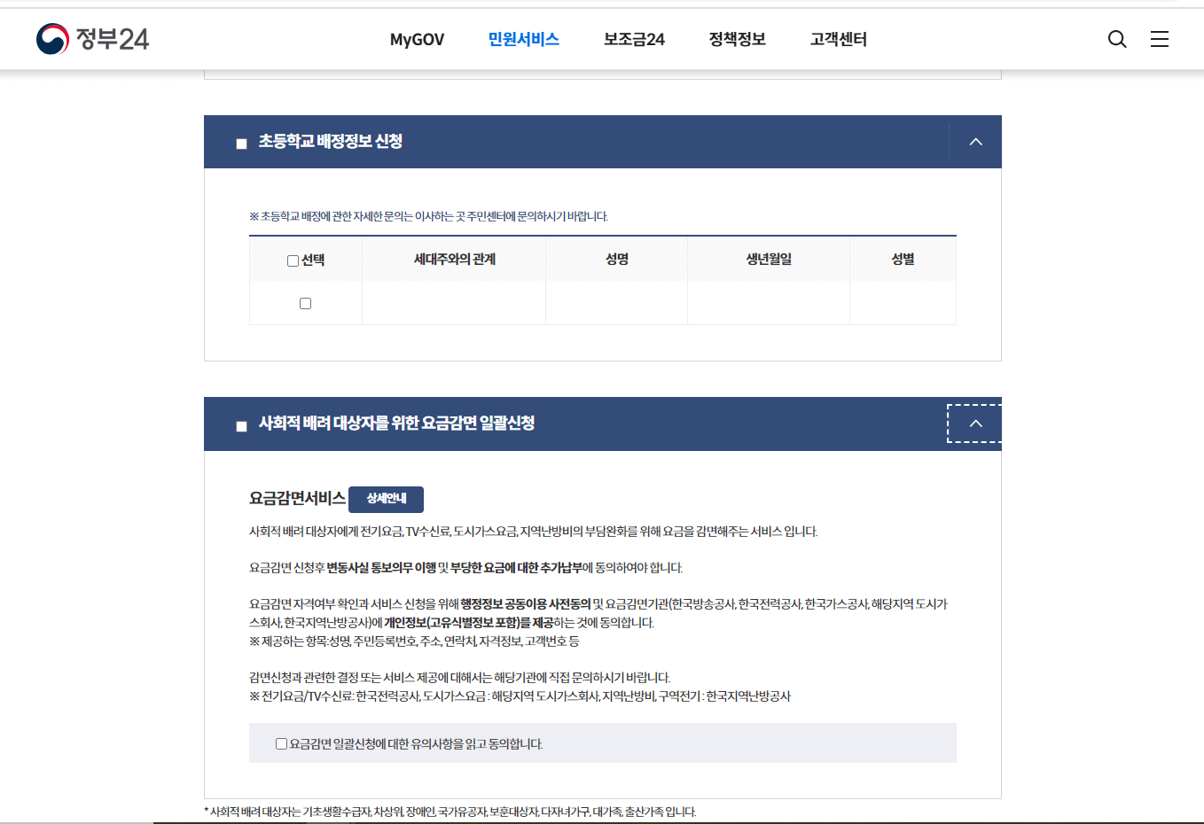 마지막으로 '초등학교 배정정보 신청'과 '사회적 배려 대상자를 위한 요금감면 일괄신청' 단계가 있습니다.