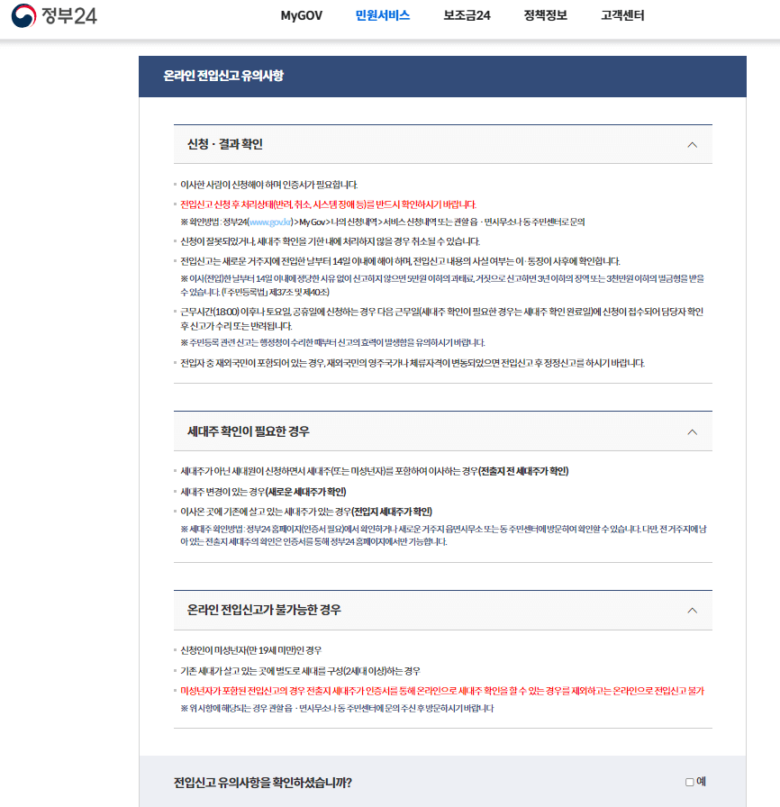 위에 안내된 바처럼 온라인 전입신고를 하시기 전에 주의하셔야 할 몇 가지 사항들이 있습니다.