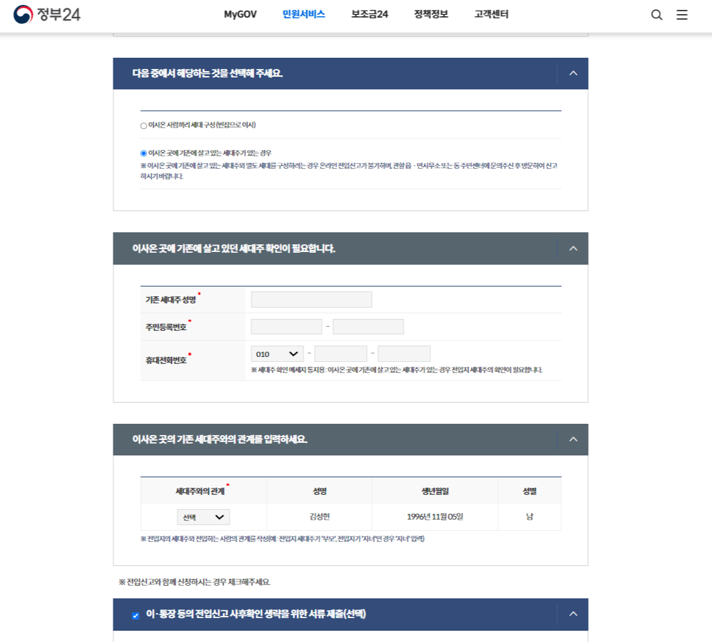 이사 온 곳에 살고 있던 기존세대주의 이름, 주민등록번호, 휴대전화 번호를 입력하고 기존 세대주와의 관계를 설정해 줍니다.