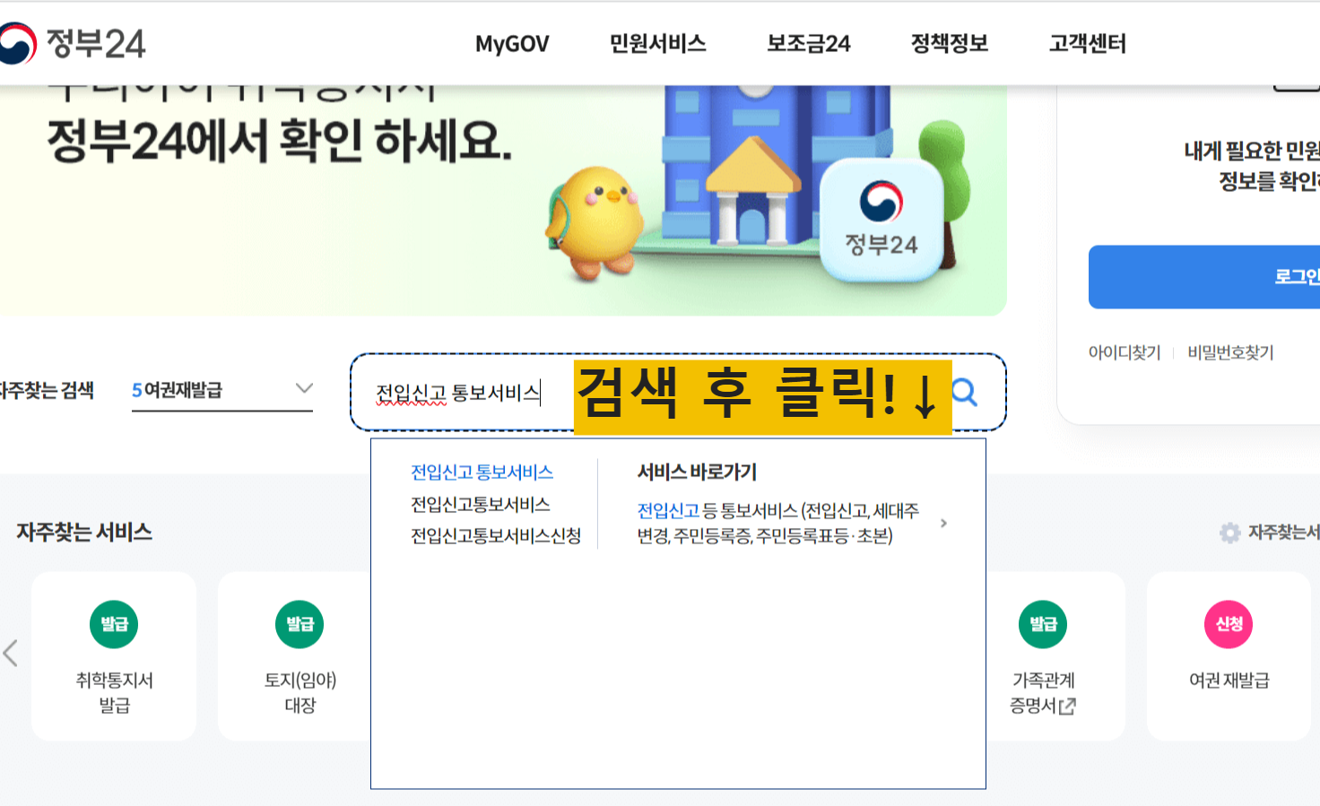여기 오신 분들은 보다 편하게 온라인으로 신청하러 오신 분들 일 테니, 먼저 온라인으로 전입신고통보서비스를 신청하는 방법을 알아보겠습니다.