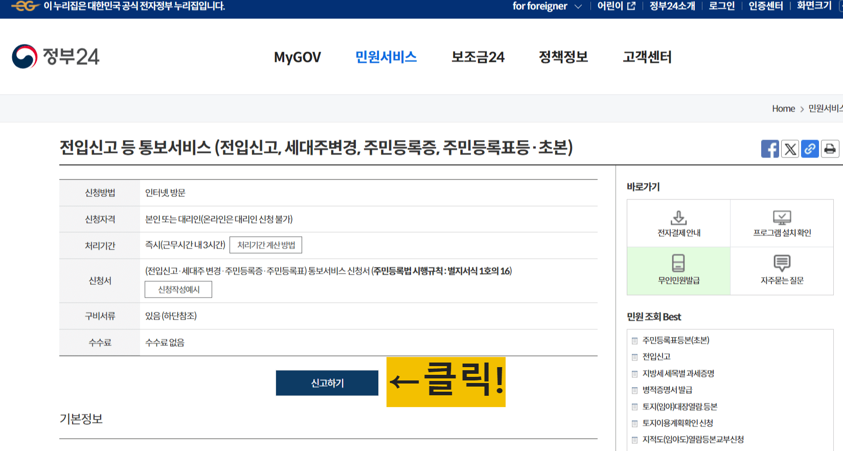 그다음 보시면 위 사진처럼 '신청서비스'란이 있고 전입신고/세대주 변경/주민등록증 발급·재발급/주민등록표 열람 또는 등·초본의 서비스 내역이 있습니다.