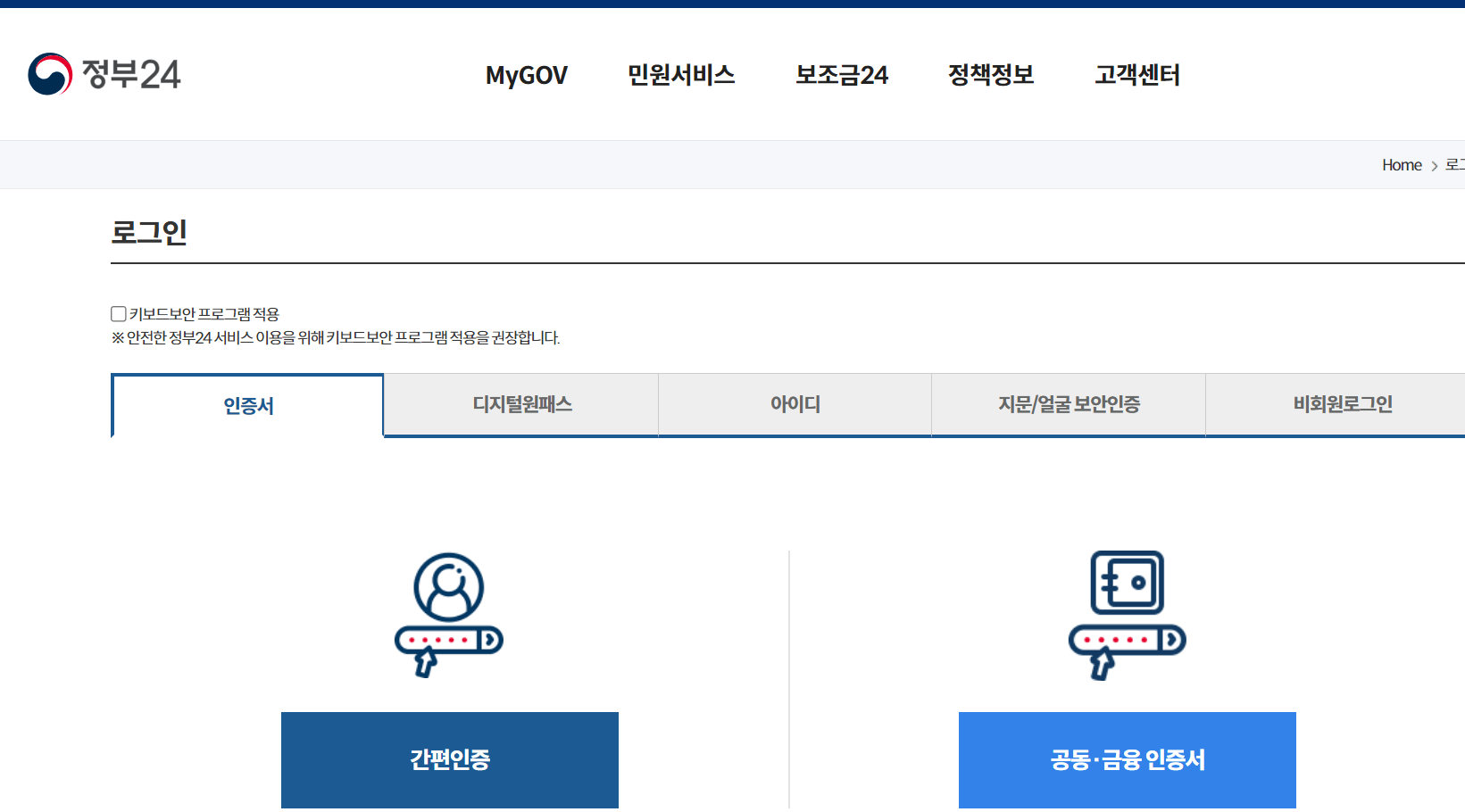 회원으로 신청하기를 눌러준 다음에(비회원으로 진행하셔도 큰 상관은 없습니다) 아래와 같이 화면이 뜰 텐데 인증서, 디지털원패스, 아이디 등 자신이 원하는 방법으로 로그인하시면 됩니다.