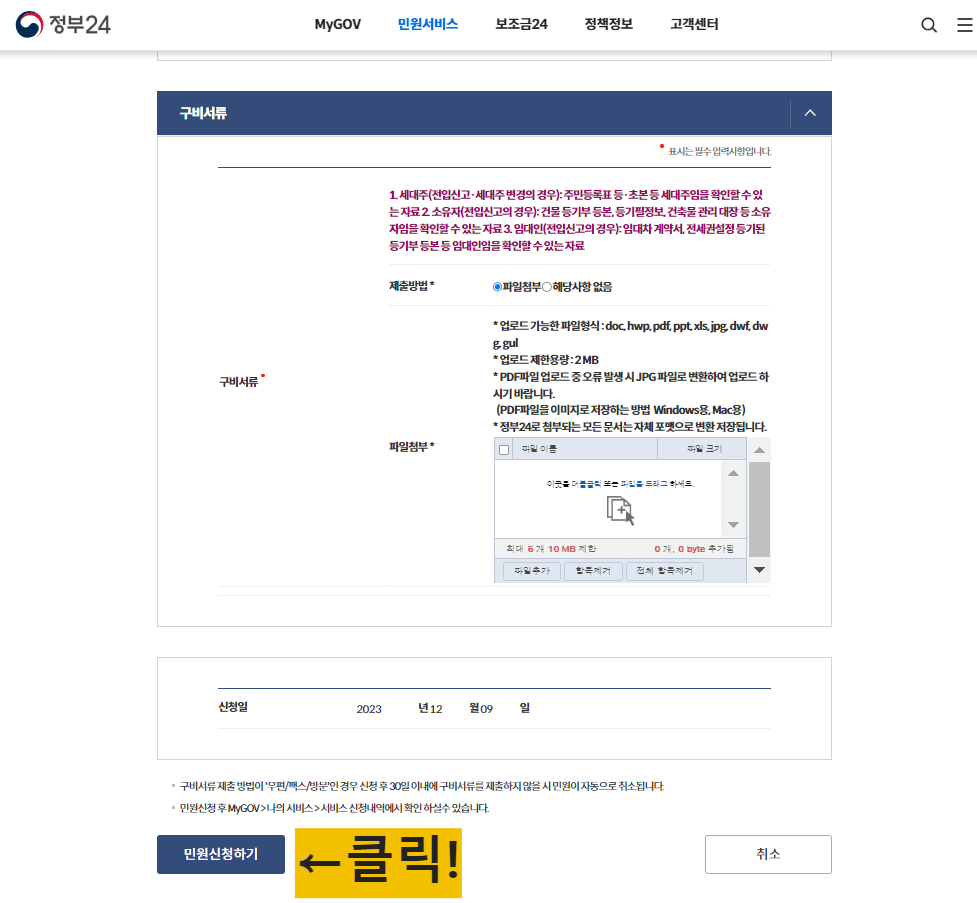 본인의 경우에 해당되는 서류를 파일첨부란에 업로드해 주신 후, 민원신청하기 버튼을 눌러주시면 전입신고 통보서비스 신청이 완료됩니다.