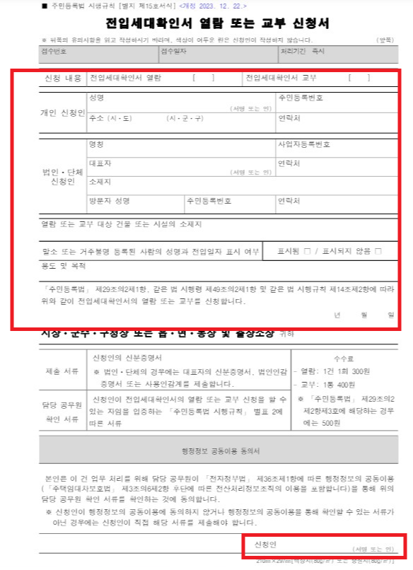 위의 사진이 저희가 근처 행정복지센터에 가시면 보게 될 서식입니다. 빨간색으로 칠한 부분만 작성해 주시면 됩니다.