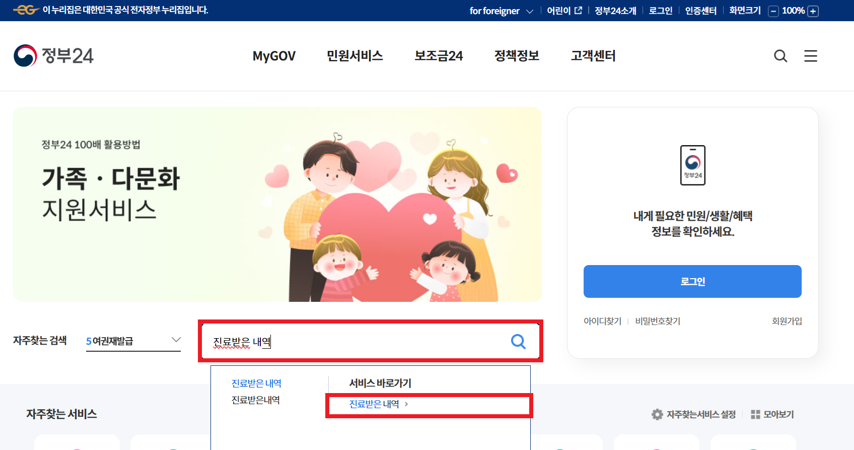 정부 24에 접속하여 가운데 검색창에 '진료받은 내역'을 검색해 준 다음 아래 빨간색으로 표시된 진료받은 내역을 클릭해 줍니다.