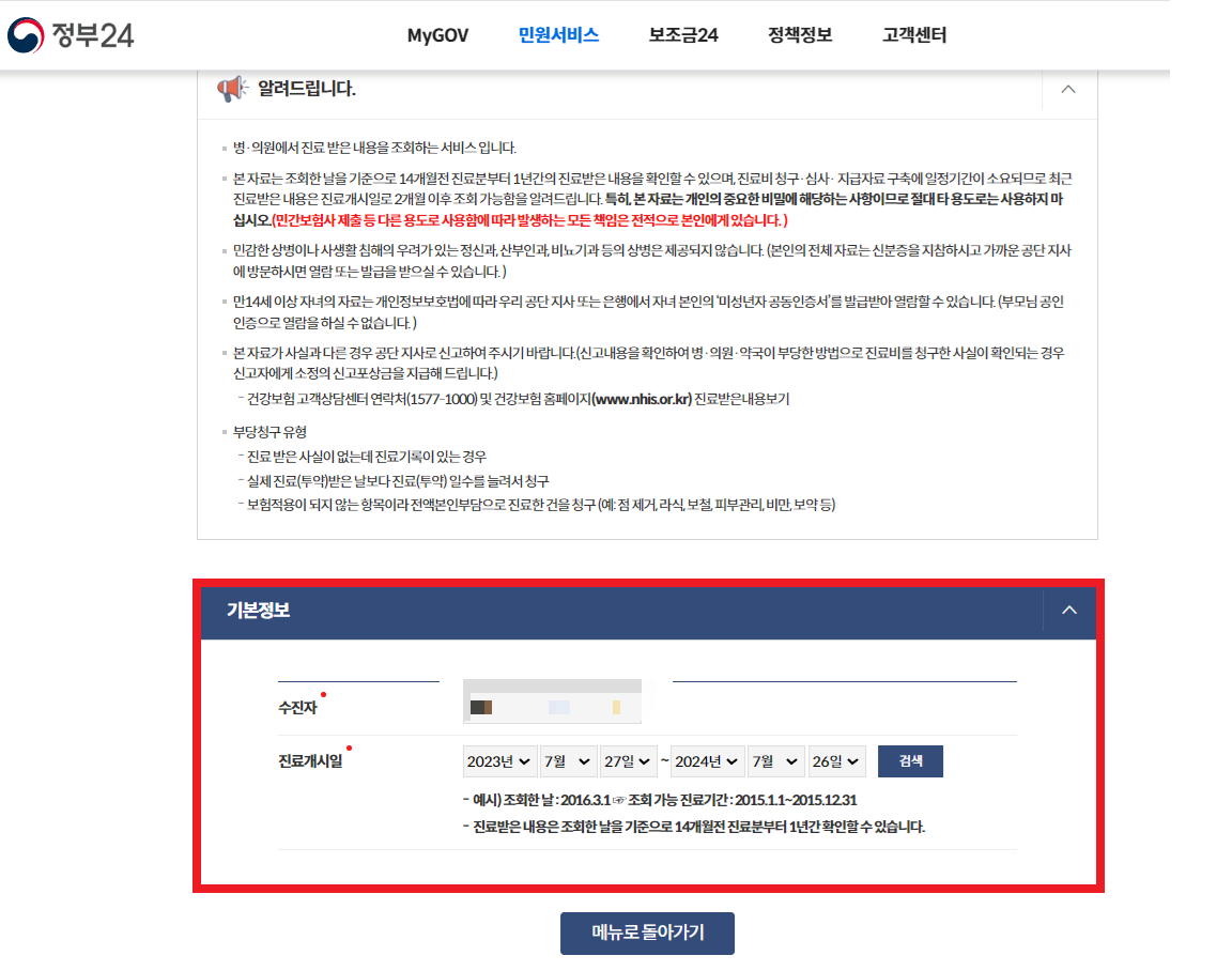 4. 진료받은 내역은 의료보험을 통해 기록된 진료만 확인할 수 있습니다. 즉, 보험 미적용 내역은 확인이 불가합니다.