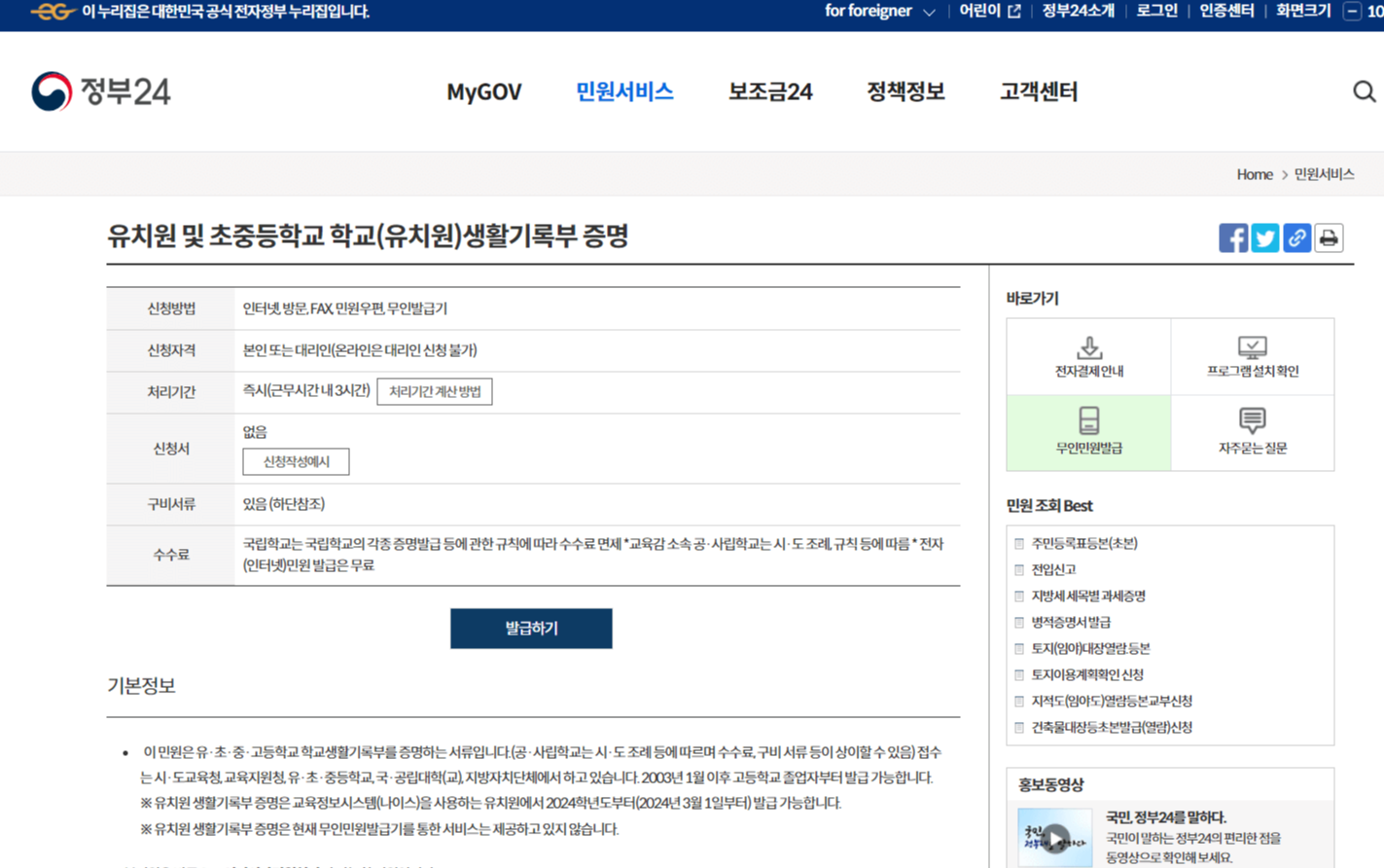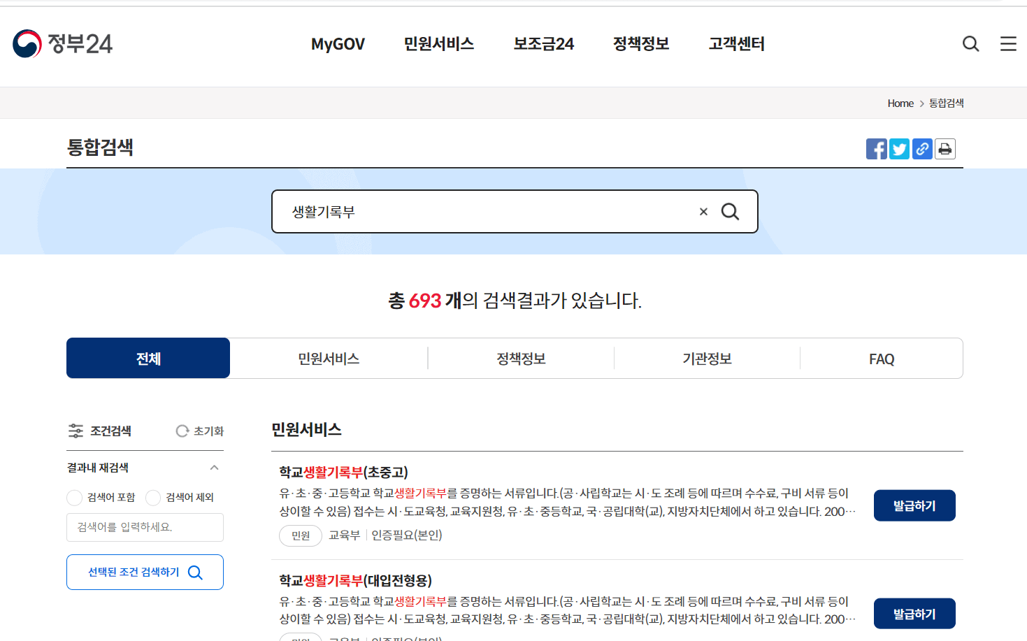 인터넷과 프린트기가 있다면 가장 쉽게 발급받을 수 있는 방법입니다. 네이버나 다음과 같은 포털사이트에 정부 24를 검색하신 뒤, '생활기록부'를 검색해 줍니다. 그럼 아래와 같은 화면이 나오는데요