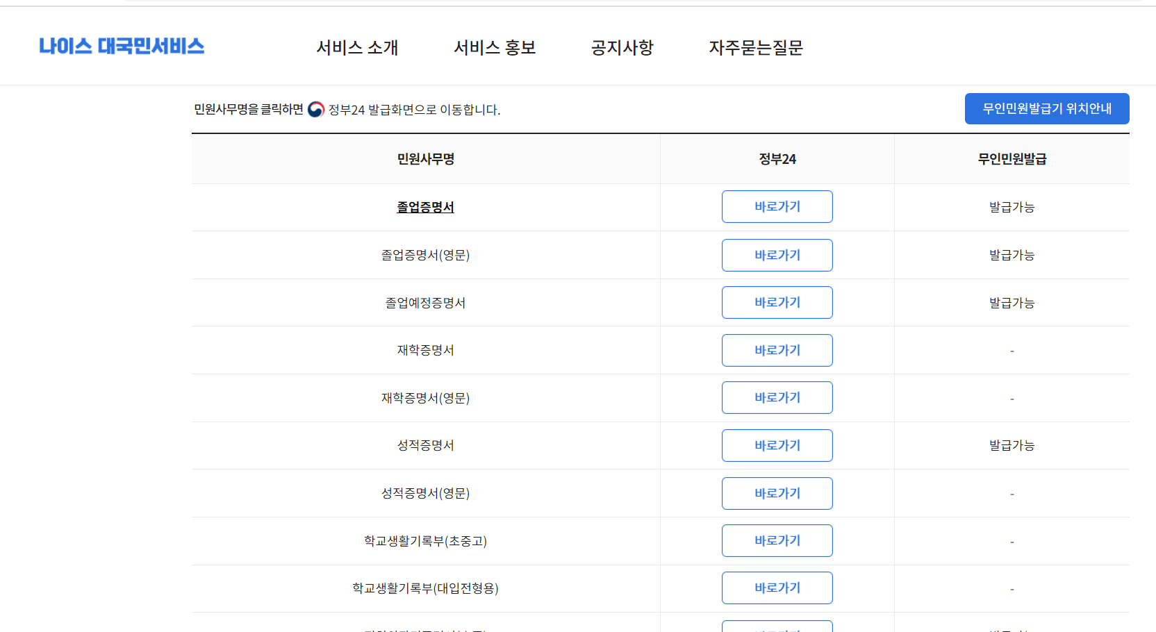 단, 이 또한 지자체마다 다를 순 있지만 무인민원발급기도 앞서 소개해드렸던 정부 24와 마찬가지로, 2010년대 초반 혹은 2000년대 초반 졸업자부터 발급받을 수 있게 되어있어서 너무 오래전 학교를 졸업하신 분들은 이용이 불가하실 수 있습니다.