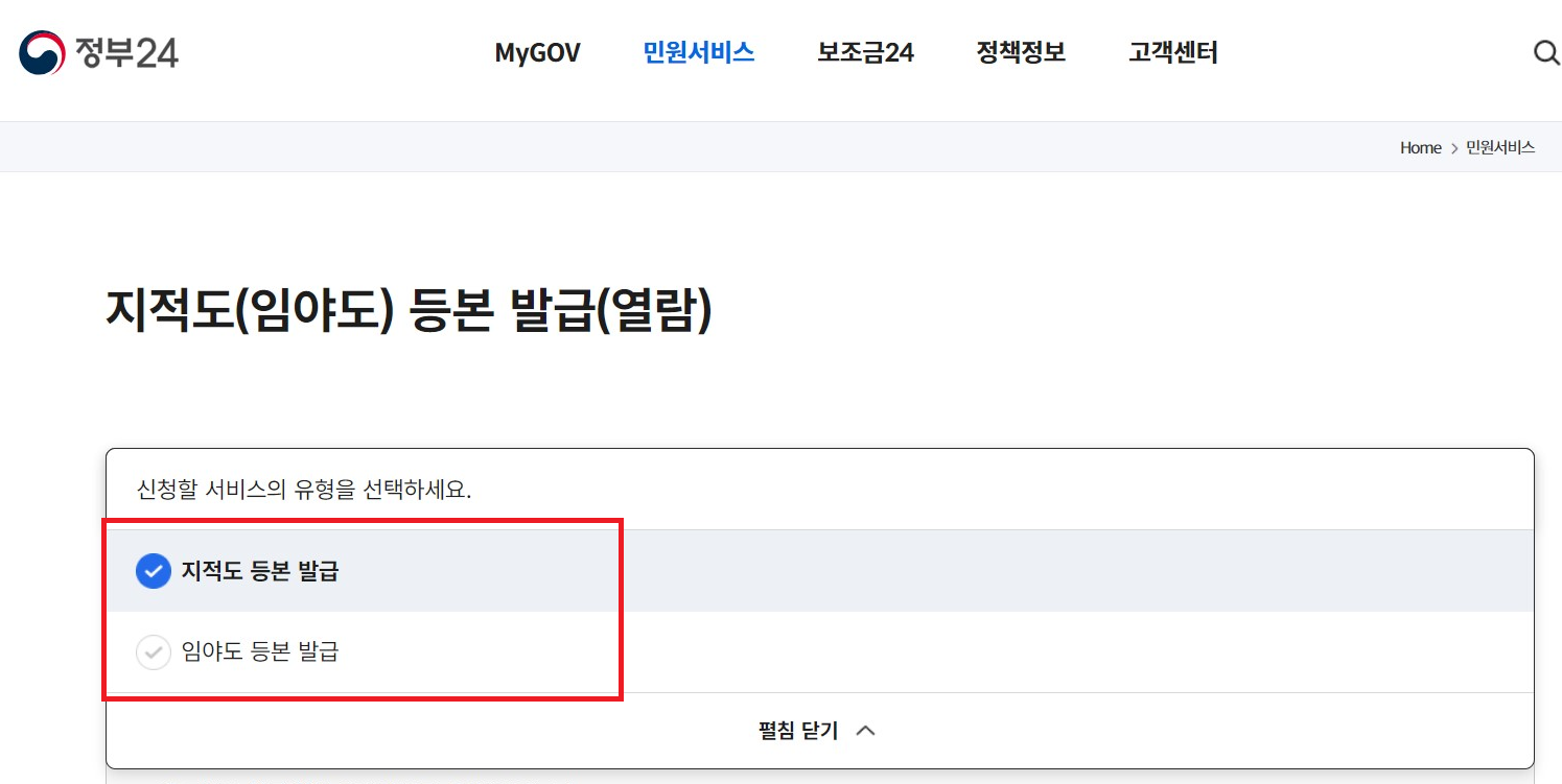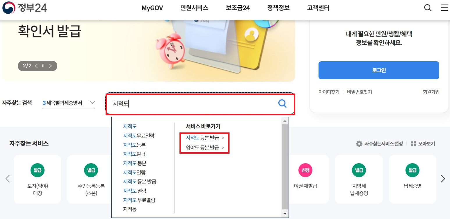 정부 24에 들어가 검색창에 지적도를 검색한 뒤, 본인이 발급받고자 하는 주소가 일반 땅이면 지적도, 임야면 임야도를 클릭하시면 됩니다.