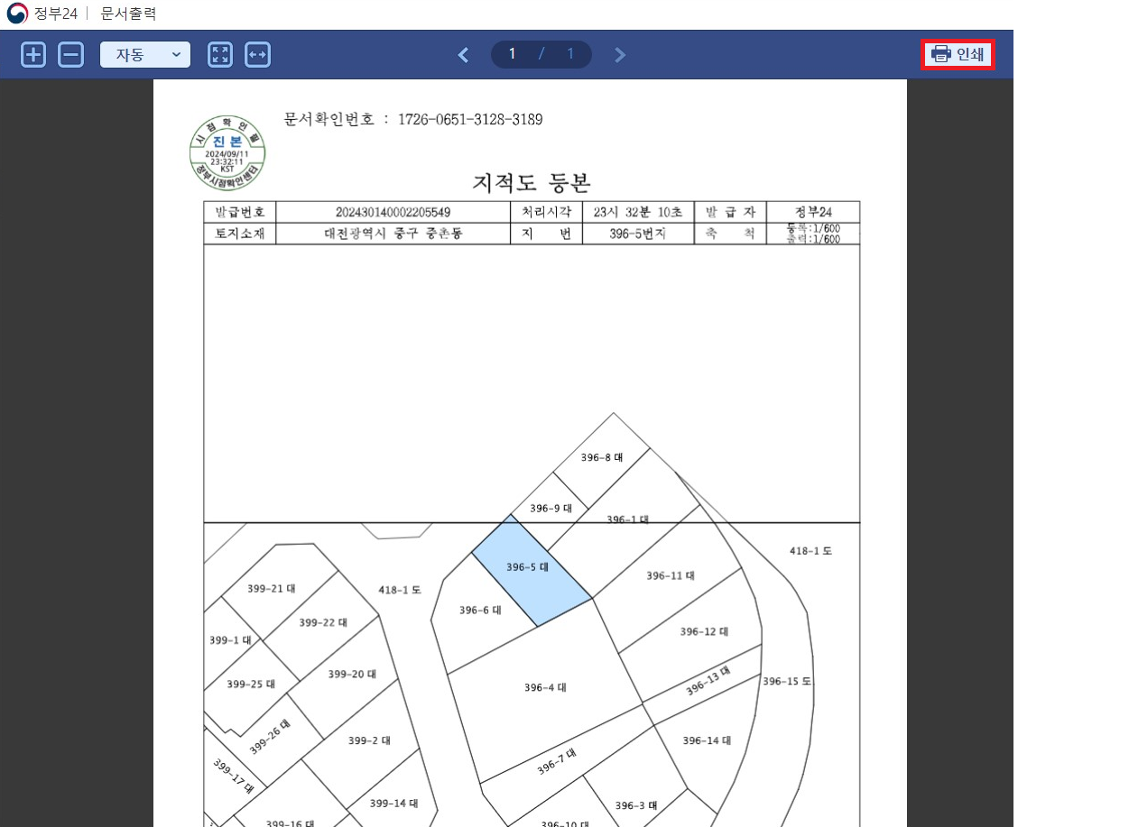 '문서출력'을 누르면 위와 같이 팝업창이 뜹니다. 여기에 본인이 신청하신 지적도가 나와있습니다. 이걸 확인하신 후, 오른쪽 상단의 '인쇄' 버튼을 클릭해 줍니다.