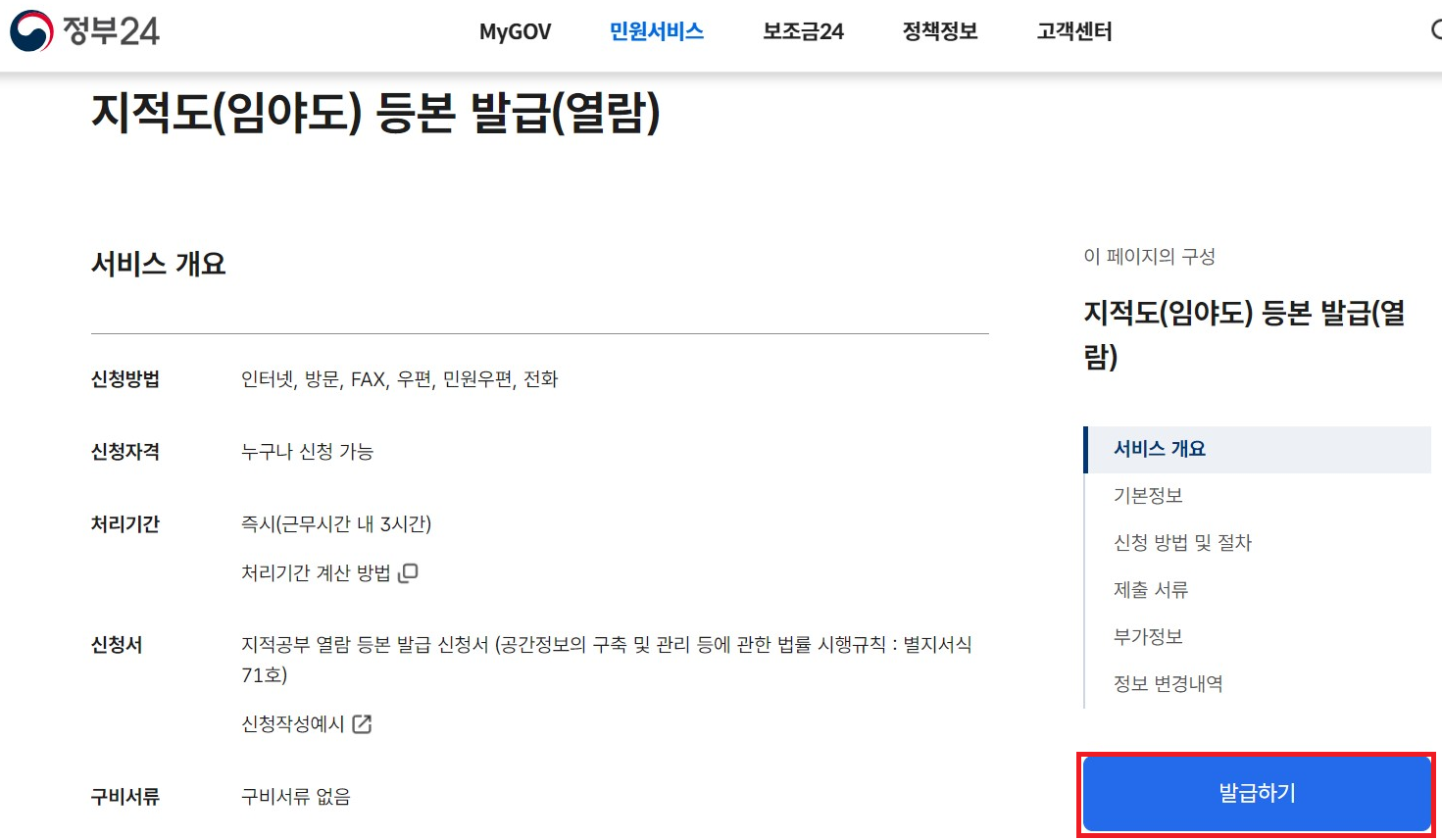 2. 정부 24를 통해서 지적도 발급을 신청할 순 있으나 열람용은 따로 신청하실 수 없습니다.
