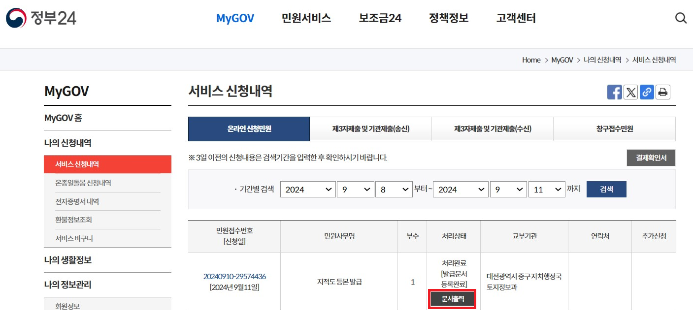 '신청하기'를 누르면 위와 같이 화면이 바뀝니다. 이때, 본인이 신청했던 서비스 신청내역에 지적도 등본발급이 들어가 있는지 확인해 준 뒤, 가운데 빨간색으로 표시된 '문서출력'을 클릭해 줍니다.