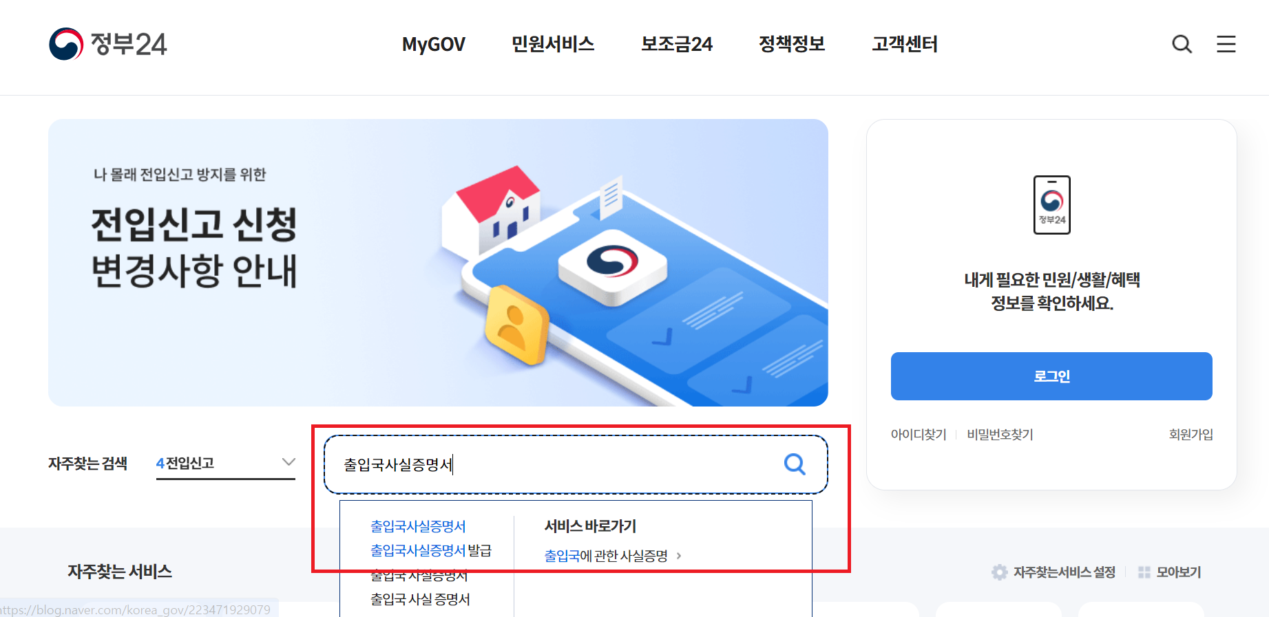 ② 정부 24 홈페이지에 들어가서 검색창에 '출입국사실증명서'를 칩니다.