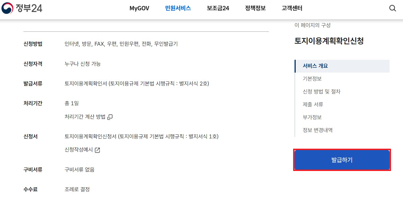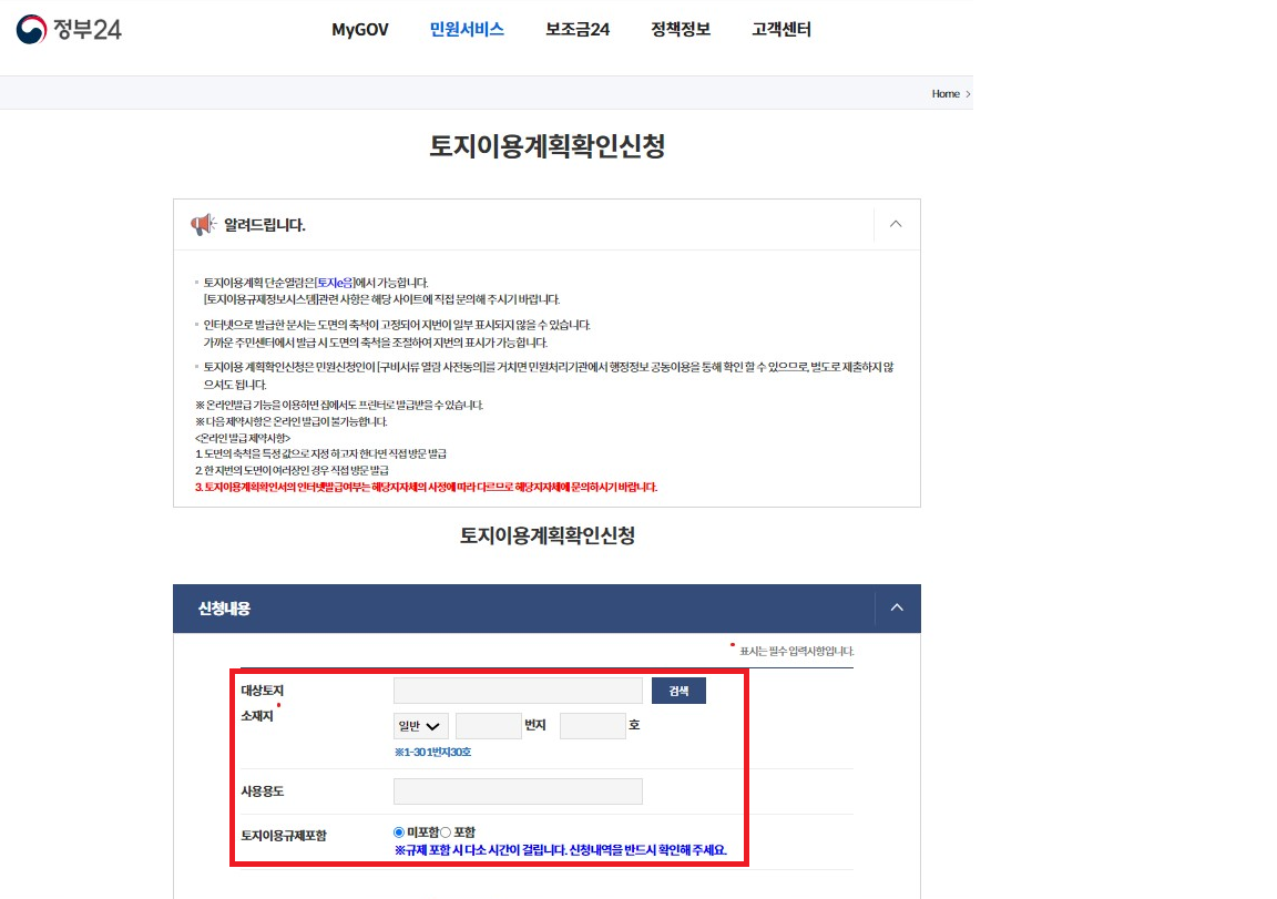인터넷에 '정부 24'를 검색하셔서 들어간 다음, 빨간색으로 표시된 홈페이지 검색창에 '토지이용계획확인신청'을 검색해 줍니다. 그러면 아래쪽 빨간색으로 표시된 '토지이용계획확인신청'이 뜨고 그걸 클릭해 줍니다.